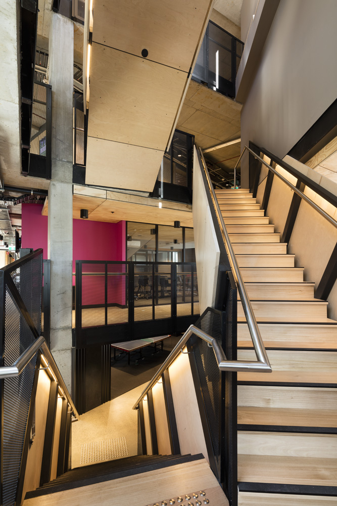 BWSA提供從低成本的公共空間到單人間再到適合夫妻居住的大型公寓。建筑的整個南翼由Quad公寓組成,其中每間包括4間臥室和兩個配套浴室。東翼的一層到三層由18平方米的SOU組成,其上層分別提供27平米和36平米的大型公寓以滿足研究生公寓市場。372間臥室傾斜布置,避免陽光直射,使居住者充分利用并享受窗邊空間。其折疊的鋅和青銅立面使建筑享受充分光照和自然的通風(fēng)標(biāo)準(zhǔn)使居住者享受最好生活空間。在建造傳統(tǒng)上,其輕質(zhì)的外表面是唯一的模塊化部件。公寓的網(wǎng)狀設(shè)計(jì)形態(tài)允許走廊側(cè)面的通風(fēng)管都可以通向屋頂。每個走廊盡頭的熱氣管道在東西走廊的內(nèi)側(cè),通過啟動窗戶吸引外面的空氣。此外,南翼通過打開窗戶采取自然通風(fēng)。